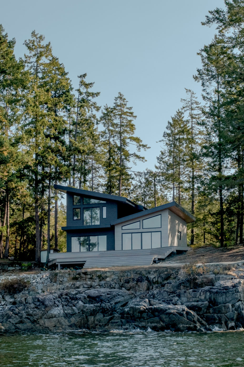 The Nest, is a custom home build situated on the top of a steep hill on a remote island boasting stunning vistas of Howe Sound.